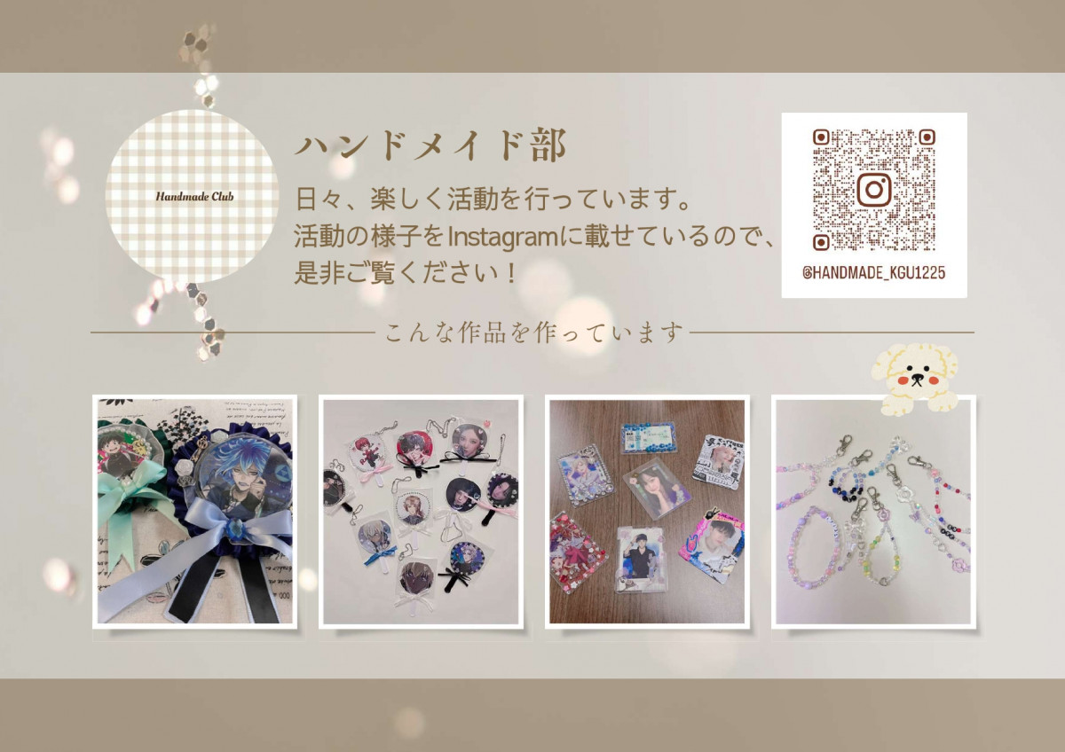 私たちハンドメイド部は月に不定期で活動しています。このサークルは推し活をしたい人、ハンドメイドが好きな人、同じ趣味の友達が欲しい人のために設立しました。