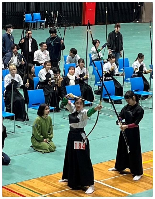 At first, I thought I would be able to draw a bow right away, but before that, I had to study the eight basic movements called “Shaho Hassetsu.” After that, I had to practice with a rubber bow and by using a makiwara. The language barrier made learning the terms for the movements in kyudo more difficult even though it is already difficult learning how to perform the movements. However, when I first saw everyone in the archery club working so hard, I knew I had to do my best as well, so I gave it my all. Also, thanks to the consideration, kindness, and easy-to-understand explanations and advice from the members of the archery club, my seniors, and the teachers, I was able to gradually grow and feel the joy of archery. When my arrow hit the target for the first time, I was so happy. Also, when all the arrows I shot hit, I was surrounded by happiness, and it was a truly unforgettable event. I was also fortunate enough to be able to participate in a competition, which was a unique experience. There was a lot to be gained. If I have a chance to come to Japan again, I would like to experience the beautiful world of kyudo again.