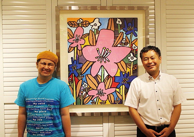 2021年には大丸福岡天神に「太田宏介カフェギャラリー」を出店。2人の後ろにある絵は「ノボタン」(2013年 F30 アクリル)