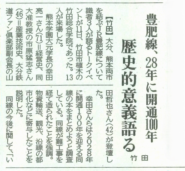 【新聞】28年に開通100年、豊肥線の歴史的意義など語る~『大分合同新聞』に掲載されました