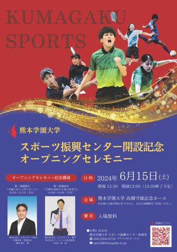2024年4月のスポーツ振興センター開設を記念し「オープニングセレモニー」を開催します。 • 開催日:2024年6月15日(土) • 時間:12:30開場、13:00開演、15:30終了予定 • 講演会:第一部講演会 (13:30~14:10) 第二部講演会 (14:20~15:20) • 場所:熊本学園大学 高橋守雄記念ホール(14号館1階)※会場には駐車場がありません。公共交通機関をご利用ください。 • 事前申込不要 • 問い合わせ先:熊本学園大学 スポーツ振興センター事務室 sports@kumagaku.ac.jp