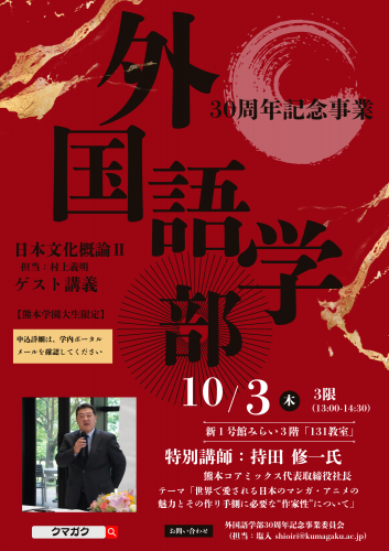熊本学園大学社外国語学部は今年度、創設30周年を迎えます。この度、30周年記念事業として、外国語学部「日本文化概論Ⅱ」授業内で、熊本コアミックス代表取締役社長の持田修一氏をお招きし、「世界で愛される日本のマンガ・アニメの魅力とその作り手側に必要な“作家性”について」というテーマでゲスト講義を開催します。