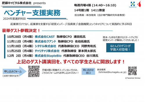 熊本学園大学商学科の2024年度新設科目である「ベンチャー支援実務」では、熊本・九州を代表するスタートアップの経営陣を招き、スタートアップへの投資プロセス、資金調達方法、成功・失敗事例、起業家精神についてお話しいただきます。