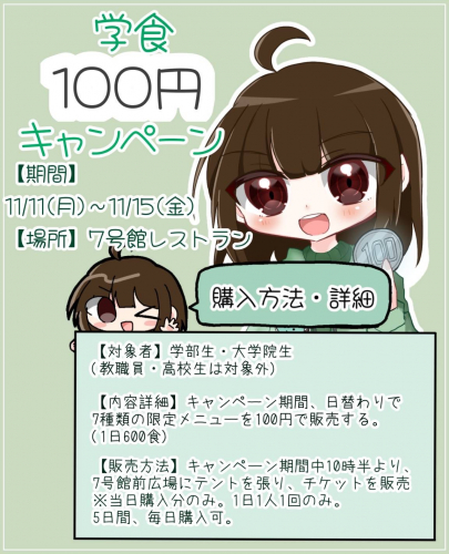 学食100円キャンペーンを開催します。 1日限定600食。対象の7種類の限定メニュー(100円)が日替わりで楽しめます。
