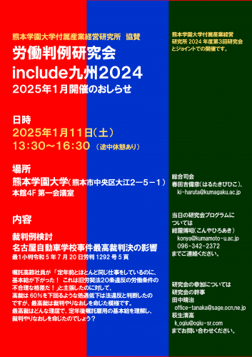 労働判例研究会include九州2024(協賛:熊本学園大学付属産業経営研究所2024年度第3回研究会)を開催します