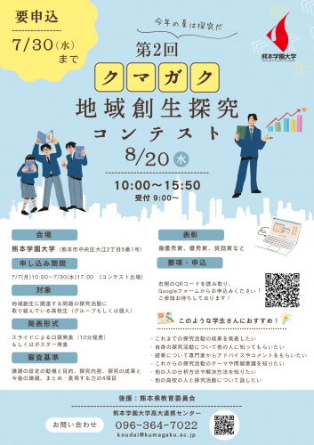 現在、高等学校では「総合的な探究の時間」等をとおして、自ら課題を設定し、解決する能力を高めていく探究プログラムの教育が行われています。この探究学習の取り組みを、本学の教員等が助言し、今後の探究学習の充実に寄与できるよう前年度に引き続き、第2回「クマガク地域創生探究コンテスト」を開催いたします。日頃の成果を熊本学園大学で精いっぱい発揮してください。