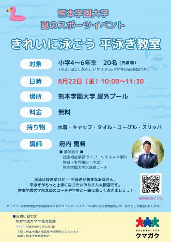 平泳ぎの上達をめざす小学生向けの「きれいに泳ごう 平泳ぎ教室」を開催いたします。熊本学園大学水泳部のコーチや学生と一緒に、楽しく泳ぎましょう!