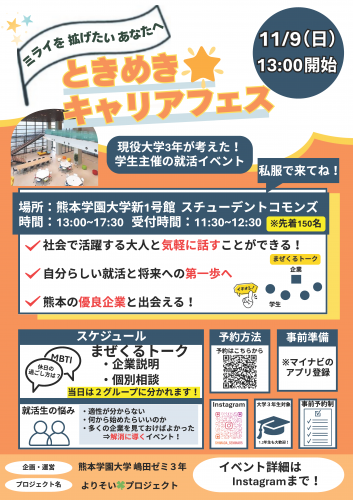 現役大学3年が考えた!学生主催の就活イベント「ときめきキャリアフェス」を開催します。熊本の企業15社が参加予定で、グループトーク形式での交流や、企業担当者との個別相談など、学生が自分の価値観や適性に合った企業と出会う機会を提供します。